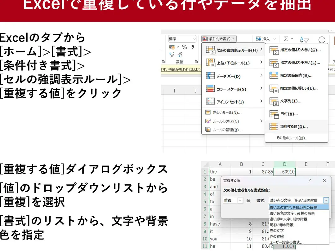 条件付き書式は、セルの値に基づいてセルの書式を自動的に変更する機能です。重複データを特定する際には、「重複値のルール」を適用し、重複しているデータを強調表示することができます。これにより、一目で重複データを把握することができます。