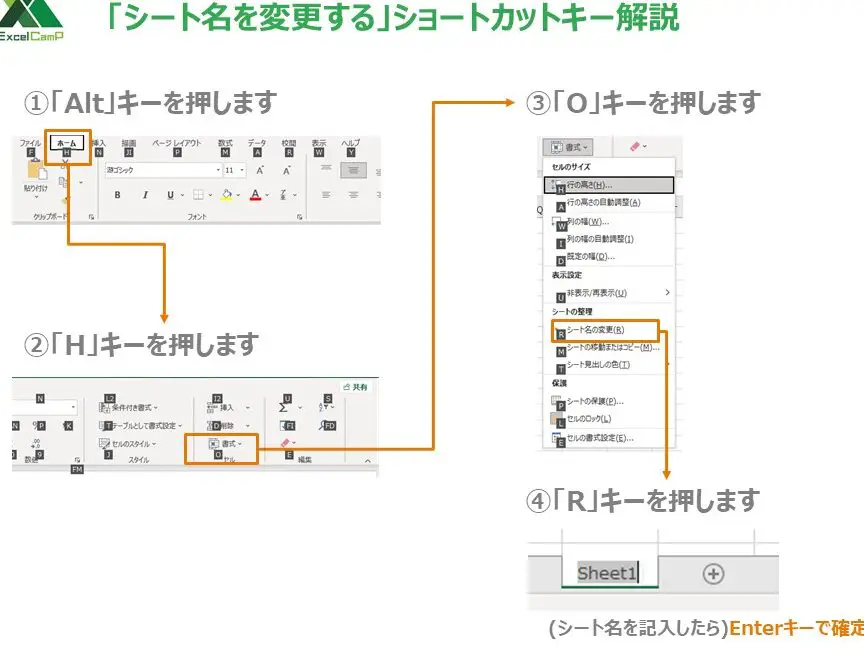 以下に、ショートカットキーを使ってシート名を変更する手順を示します。