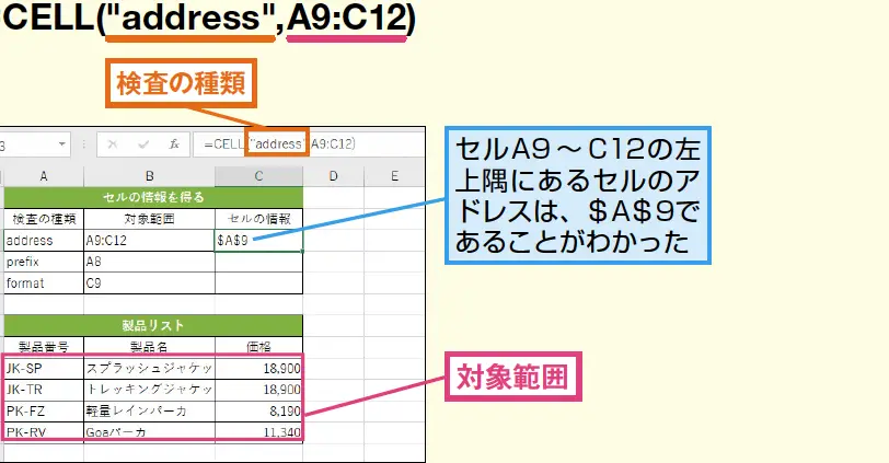 | CELL | セルの情報を取得する(番地を取得することも可能) |