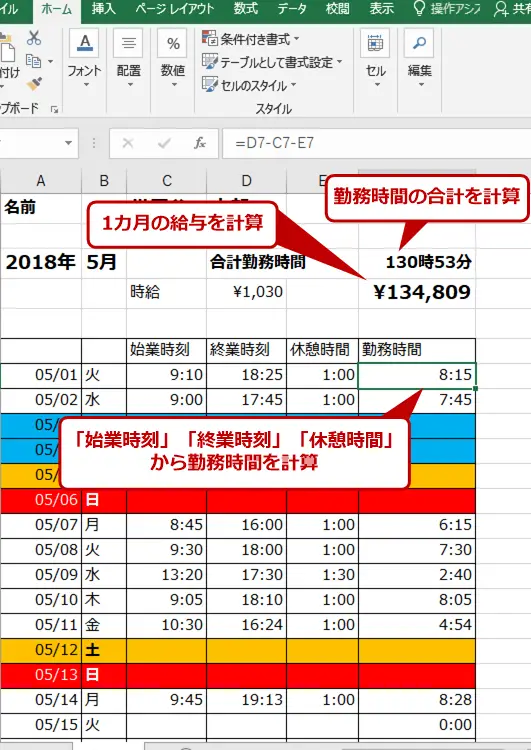 Excelで勤務時間を計算する際、休憩時間を除外する方法はありますか?