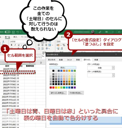 Excelで曜日ごとにセルを色分けする方法は?