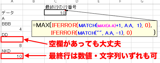 - この式を入力すると、最終行の行番号が取得されます。必要に応じて、この値を使用して処理を行います。