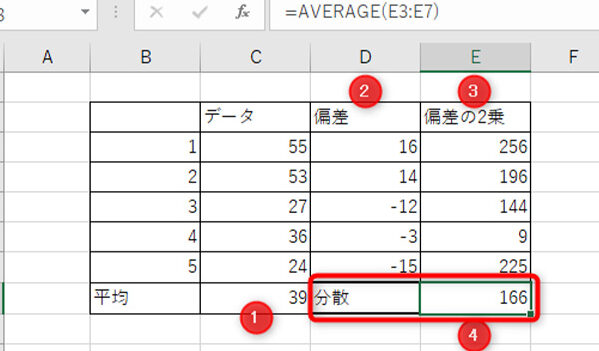 1. データをExcelに入力します。 2. 分散を求めるために、=VAR.P(範囲)または=VAR.S(範囲)と入力します。 3. 分散の値を求めたセルに、=SQRT(セル)と入力して、平方根を求めます。これが標準偏差です。