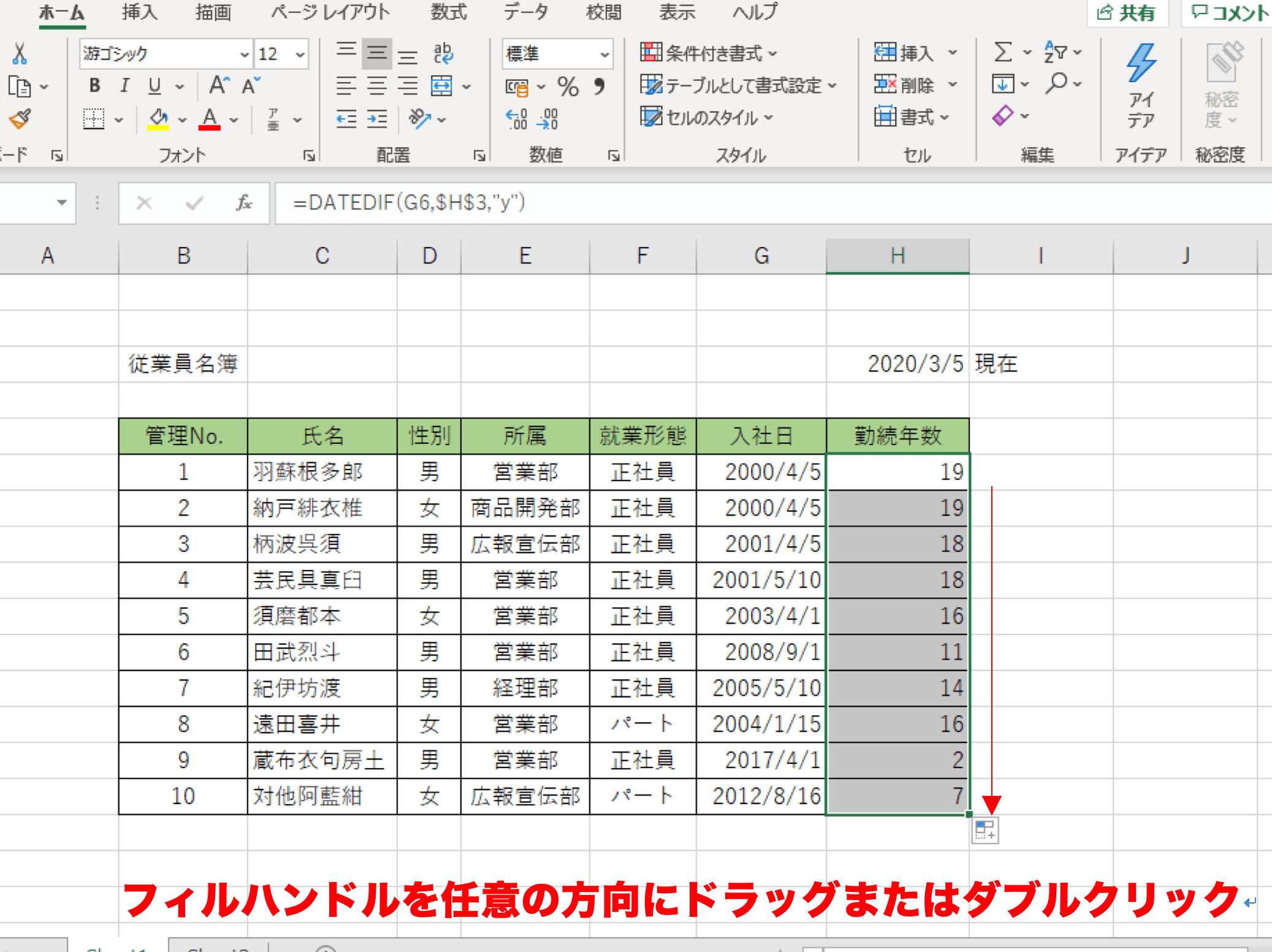 以下は、DATEDIF関数を使用して期間を求める例です。