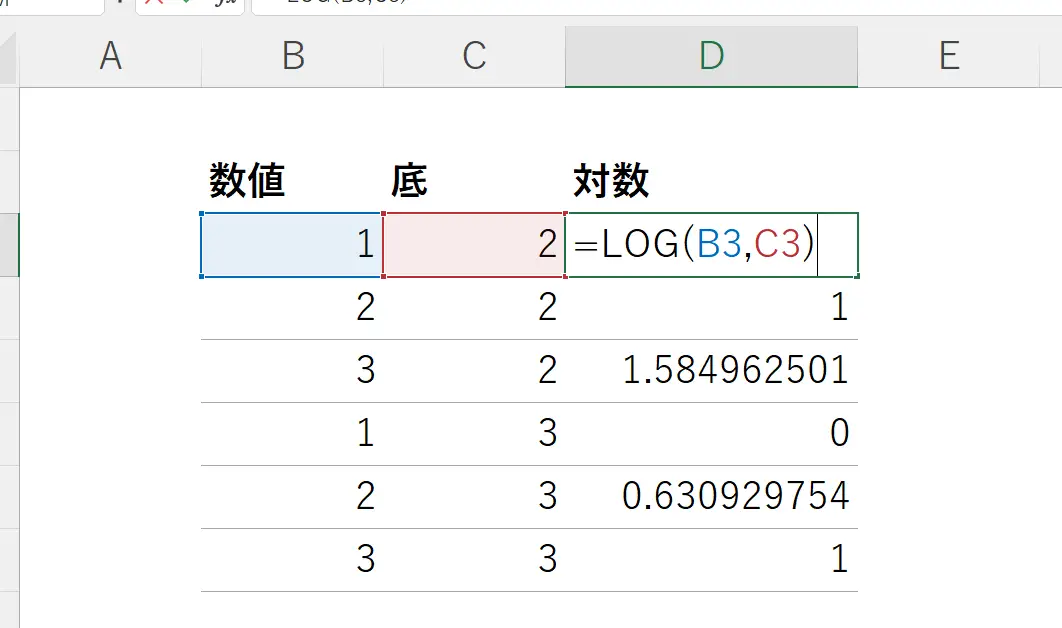 - 10を底とする2の対数: =LOG(2, 10) または =LOG(2)