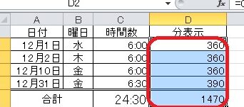 | 時間の小数を分に変換 | =INT(A1)60 + MOD(A1,1)60 |
