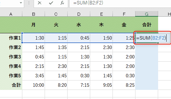 - 作業時間の合計:作業時間の引き算を行った結果を複数のセルに保持している場合、SUM関数を使用して、これらのセルを合計することができます。