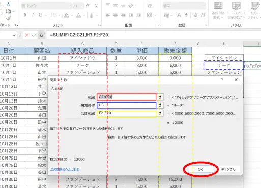 - =SUMIFS(集計する範囲, 条件範囲1, 条件1, [条件範囲2, 条件2], …)と入力します。