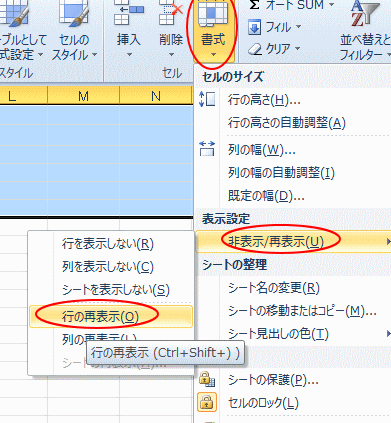 行が非表示になっている場合も再表示できない原因となります。行の非表示設定を解除する方法を説明します。