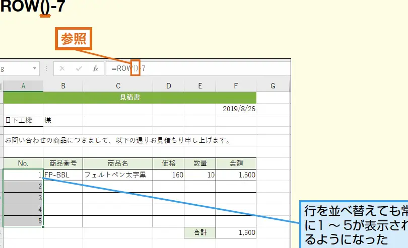 - 関数を含むセルの行番号を取得する場合: =ROW()