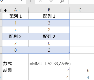 ここで、行列1と行列2は、行列を表す範囲です。行列1の列数は行列2の行数と同じでなければなりません。関数は、行列1の行数と行列2の列数を持つ新しい行列を返します。
