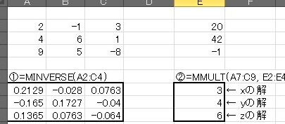 - MINVERSE関数を使って係数行列の逆行列を求めます。
