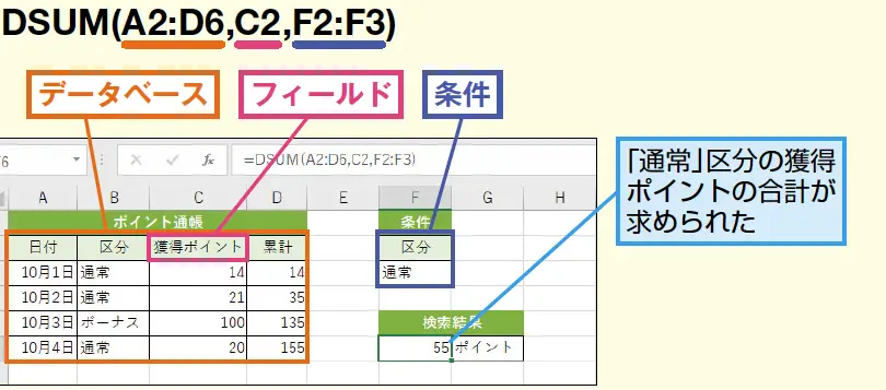DSUM(データベース、フィールド、条件)