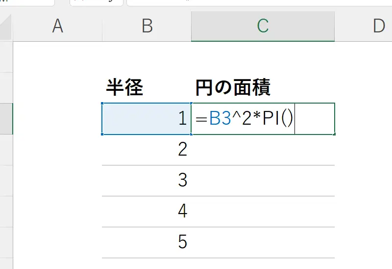 次に、πを含む計算を行いたい場合は、その数式の中にPI関数を組み込んでください。例えば、半径が5の円の面積を計算する場合、「=PI()5^2」と入力します。
