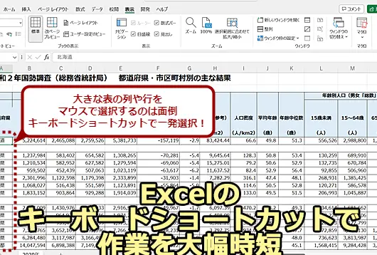 | Ctrl + Shift + 方向キー | データの最後のセル/行/列まで選択しながら移動 |