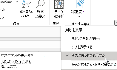リボンを表示/非表示にすることができます。リボンを非表示にすると、作業領域が広がり、データの表示や編集が容易になります。リボンを非表示にするには、右上の「リボンの表示を切り替え」ボタンをクリックします。リボンを再び表示するには、同じボタンをクリックするか、任意のタブをクリックします。