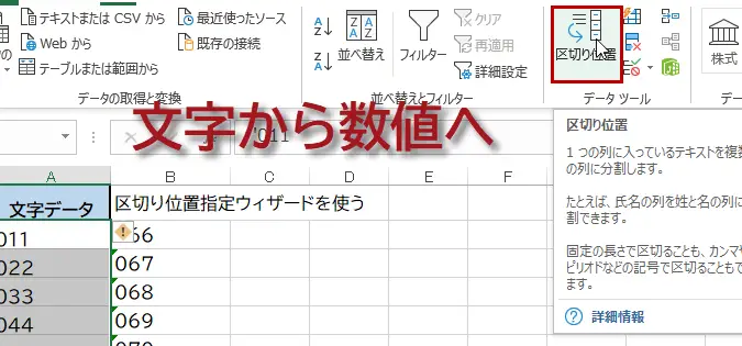 - 数式を使う: 文字列を数値として扱う数式を使って、数値に変換することができます。例: =(123+0)