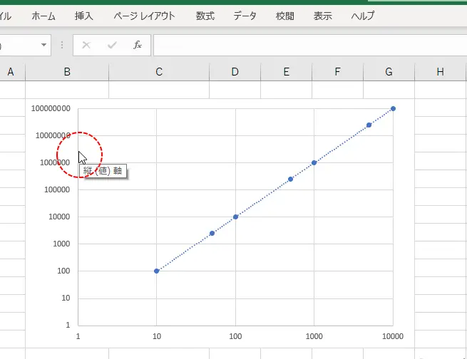 Excel片対数グラフ:片方の軸を対数スケールにする方法