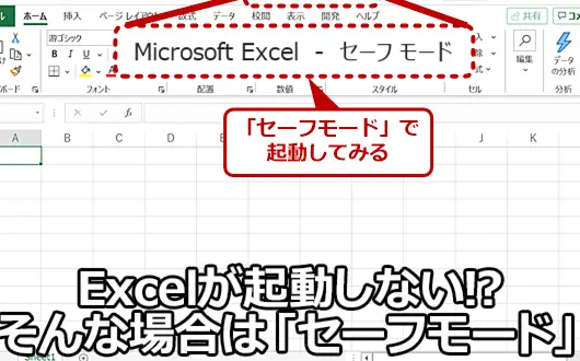 - Excelのセーフモードで起動する。セーフモードで起動すると、アドインやプラグインは読み込まれません。