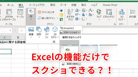 Excelには、「挿入」→「図」→「スクリーンショット」という機能があります。これを使って、Excelの画面を直接撮影することができます。